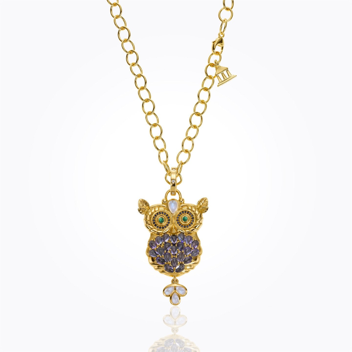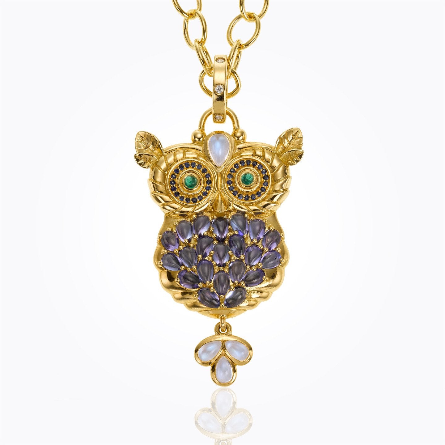 Write a review for 18K Great Horned Owl Pendant with Royal Blue Moonstone, tanzanite, emerald, blue sapphire and diamond